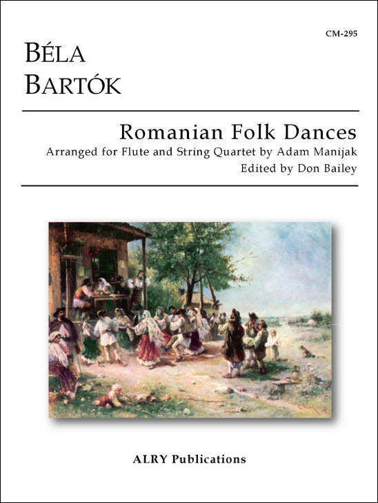 Béla Bartók’s Romanian Folk Dances (Sz. 5G, BB G8) are an expression of his pioneering work in ethnomusicology, in particular the folk music of Eastern Europe. Composed initially for piano in 1915 and orchestrated in 1917, these six short pieces are direct transcriptions and arrangements of authentic Romanian folk tunes that Bartók collected during his research trips through Transylvania at the turn of the 20th century. They are arranged here for flute and string quartet by Adam Manijak and edited by Don Bailey.